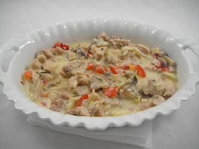 Fabulous one-pan meal. The creamy chicken and veggie mixture crowned with mashed potatoes.
