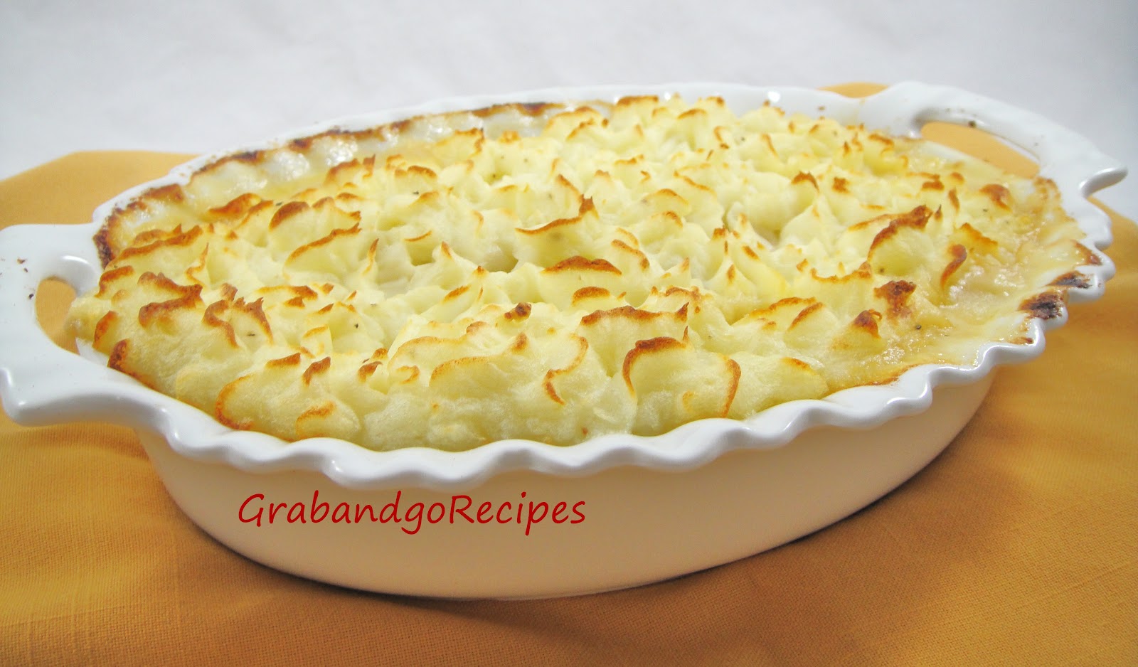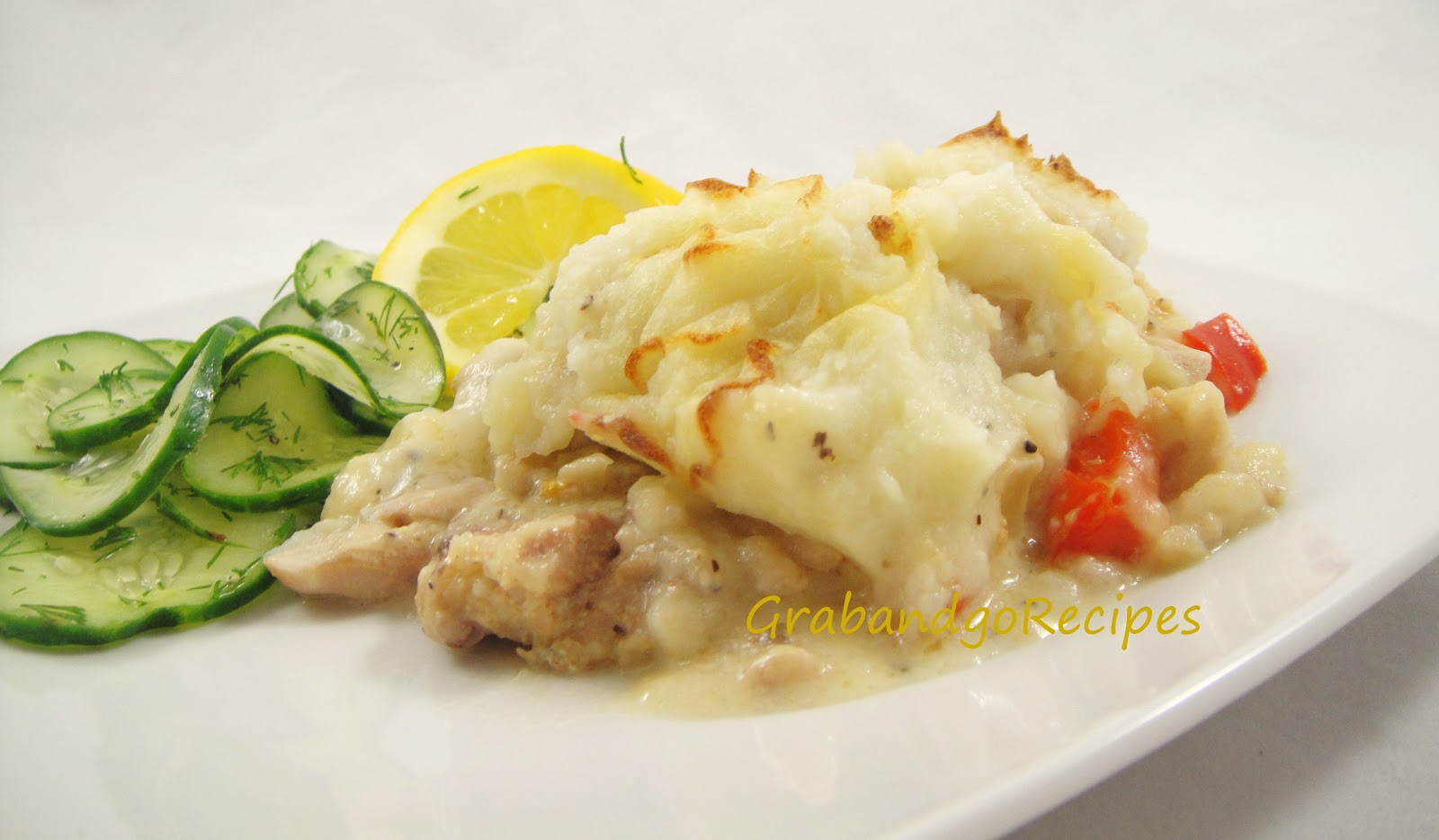 Fabulous one-pan meal. The creamy chicken and veggie mixture crowned with mashed potatoes.