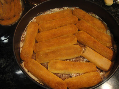 Dip ladyfingers in coffee mixture and place in pan…if necessary break biscuits to fit.